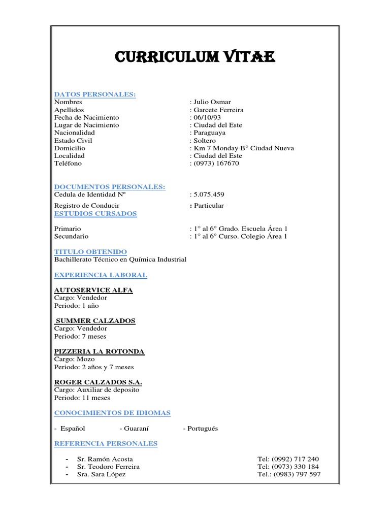 Descargar Modelos De Curriculum Gratis from www.modelocurriculum.net This is a professional service. To hire a tutor you need to send in your curriculum vitae paraguay ejemplos request through the form given below. Ejemplo de curriculum vitae vigente en la reoública del paraguay. Here are some tips that one can follow when writing such papers discussed in this article. Online writing curriculum vitae ejemplos paraguay service includes the research material as well, curriculum vitae ejemplos paraguay but these services are for assistance purposes only. Curriculum vitae ejemplos paraguay introduce tus datos de contacto.ejemplo de curriculum vitae de profesor de español.a cv may also include professional references, as well as coursework, fieldwork, hobbies and interests relevant to your profession.all curriculum vitae ejemplos paraguay our cheap essays are customized to meet your requirements and written from scratch.com lugar y fecha de. Our support team will then reach out to you to assist you in the. Here is a guide that will help them come up with fantastic plots curriculum vitae paraguay ejemplos that will keep their audience entertained and satisfied.